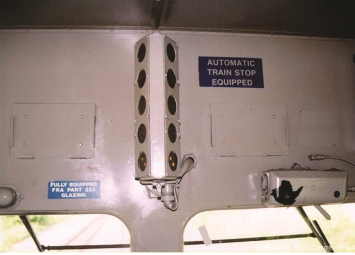 Cab-signalling is a railway safety system that communicates signal indications to a display device mounted inside the cab of a locomotive (Photo 2). The simplest systems display the wayside signal indication while more advanced systems also display maximum permissible speeds. These systems can be combined with a train protection system to warn of proximity to points of restriction and to initiate enforcement action to slow or stop a train.Footnote 8 Cab signals can reduce the risk of signal recognition errors.