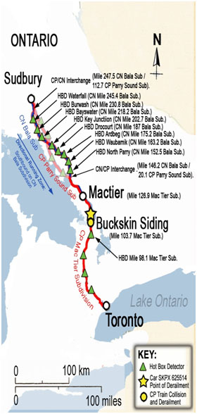 The CP Parry Sound Subdivision consists of a single main track that extends southward from Romford, Ontario (Mile 121.7) to MacTier (Mile 0.0). The southernmost CP HBD on the Parry Sound Subdivision is located at Mile 26.0. The CP MacTier Subdivision consists of a single main track that extends southward from MacTier (Mile 126.9) to Osler, Ontario (Mile 0.0). For trains travelling southward from MacTier, the first CP HBD encountered is located at Mile 98.1. Train movements in the derailment area are governed by the Occupancy Control System as authorized by the Canadian Rail Operating Rules (CROR) and supervised by a Rail Traffic Controller (RTC) located in Montréal, Quebec. The track is Class 4 according to Transport Canada (TC) approved Railway Track Safety Rules (TSR). The maximum speed permitted is 50 mph for expedited intermodal freight trains. Rail traffic through this location consists of approximately 29 freight trains per day with an annual tonnage of about 30 million gross tons.