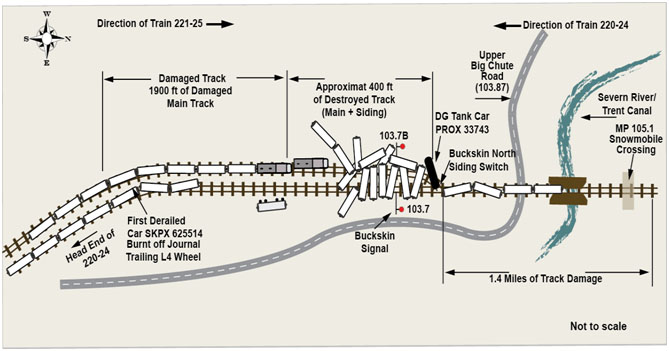 On 26 January 2011, at approximately 0310, Eastern Standard Time, as Canadian Pacific Railway (CP) freight train 220-24 was travelling southward at about 45 mph, one of its cars derailed at Mile 105.1 of the CP MacTier Subdivision, near Buckskin, Ontario. The train continued on to the Buckskin north siding switch at Mile 103.7 where an additional 20 cars, including dangerous goods tank car PROX 33743, loaded with non-odorized liquefied petroleum gas (UN 1075), derailed. Some of the derailed cars side-swiped northbound CP freight train 221-25, which was stationary in the Buckskin siding, derailing its lead locomotive, and damaging the second locomotive and the first 9 cars on train 221. As a precaution, 15 families from the nearby area were evacuated. There were no injuries and no loss of product.
