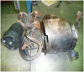 The L-4 axle journal had burnt off the axle approximately 4 inches from the axle journal fillet radius. The remaining axle journal profile was typically conical in shape tapering down to a 4 inch diameter at the point of separation. All remaining L-4 bearing components were severely heat discoloured, smeared, and plastically deformed (see Photo 2). Heavy spalling was observed on the inboard cup raceway. The corresponding cage, rollers and all seals lips were destroyed (see Photo 3). The outboard cone assembly, spacer and both seal casings remained fused to the cup through the load zone.