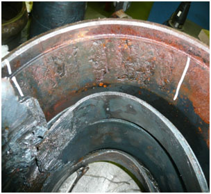 In this case, the cone bores of the cone assemblies in both roller bearings measured an average of 6.189 inches. In addition, the L-3 axle journal was slightly undersized (6.190 inches). Cone rotation on the axle journal is a recognized cause of roller bearing failure in the industry. The combination of oversized cone bores mounted on an undersized axle journal increases the risk of cone rotation on the journal which can initiate roller bearing failure.