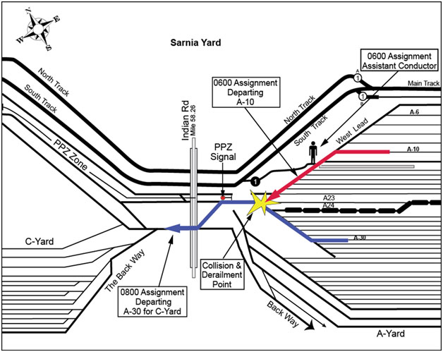 The 0800 assignment had travelled from C-yard through the point protection zone (PPZ)Footnote 1 and on to the west lead into A-Yard to pick up cars from track A-30 and return with them to C-Yard. At about 1225,Footnote 2 after lifting cars from track A-30, the 0800 assignment departed A-Yard and proceeded westward back towards C-Yard.