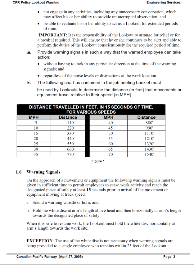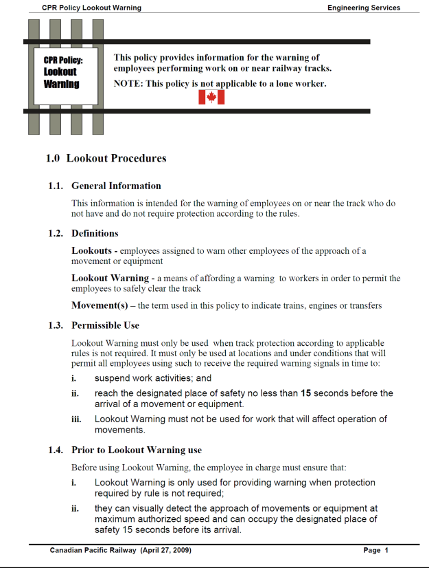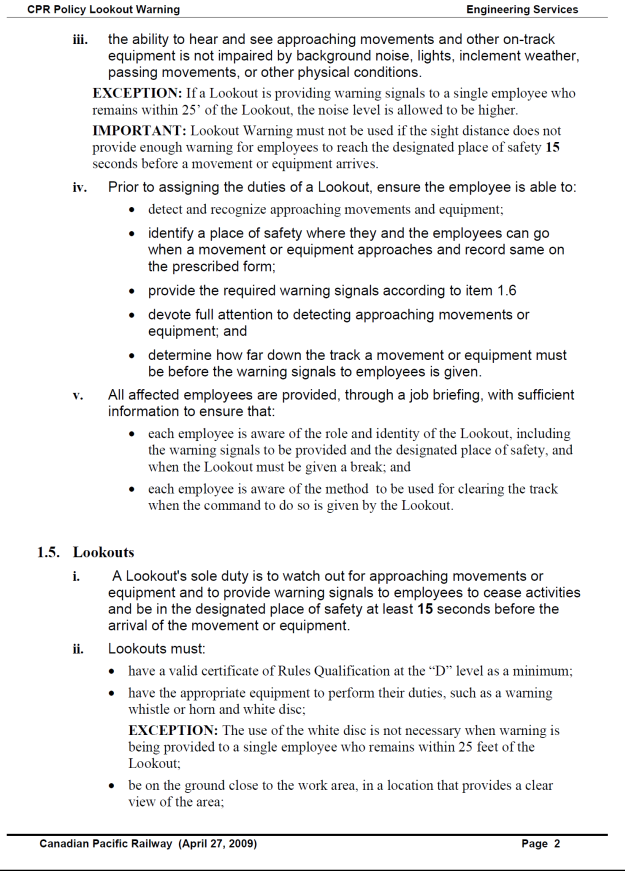 CP Rail's Lookout Warning Policy (Appendix A) is a similar form of track worker protection to that of CN's safety watch. Before using the Lookout Warning Policy, the employee in charge must (in part) ensure that: