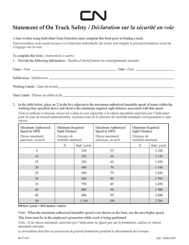 CN adopted the use of such track worker protection. Written guidelines to accompany their application were established in 2006 within CN's General Engineering Instructions (GEI):
