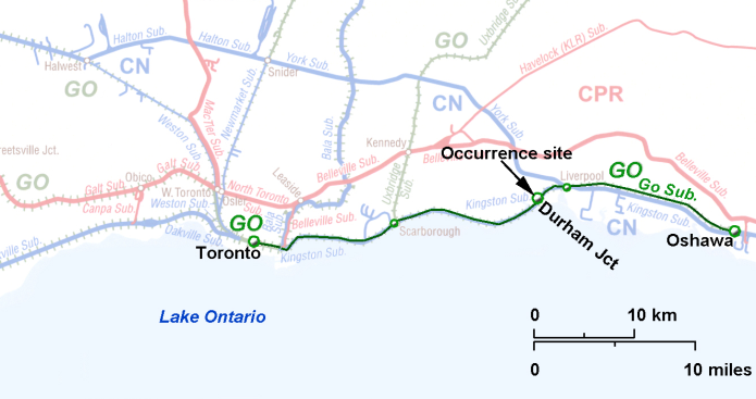 The Kingston Subdivision consists of double track and multi track extending from Mile 10.3 (Dorval, Quebec) to Mile 333.8 (Toronto, Ontario). These tracks connect with the GO Subdivision at Mile 313.9 (Durham Junction). The Kingston Subdivision is CN's main east/west corridor for passenger and freight traffic through Southern Ontario. In the accident area, the maximum permissible speed is 65 mph for freight trains and 100 mph for passenger trains. Train movements on both the Kingston and GO Subdivisions are controlled by the Centralized Traffic Control System (CTC), as authorized by the Canadian Rail Operating Rules (CROR) and supervised by an RTC located in Toronto.