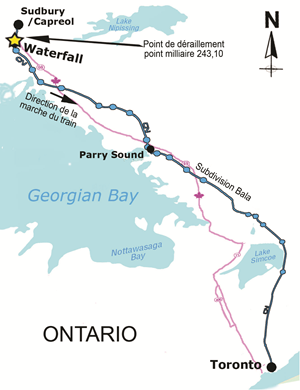 The CN Bala Subdivision is single main Class 4 track,Footnote 5 which extends from Toronto (Mile 0.0) northward to Capreol (Mile 276.1). Under the terms of a directional running agreement between CN and Canadian Pacific Railway (CP), southbound traffic from Sudbury to Parry Sound travels on the Bala Subdivision between Mile 146.2 and Mile 247.5. Movements on the Bala Subdivision are governed by the Centralized Traffic Control system (CTC), as authorized by the Canadian Rail Operating Rules (CROR) and supervised by a rail traffic controller (RTC) in Toronto. At the time of the occurrence, there was a 45 mph permanent slow order (PSO) in the vicinity of the derailment. Southward trains were further required to reduce speed to 40 mph by Mile 241.4, and then to 35 mph by Mile 240.10.