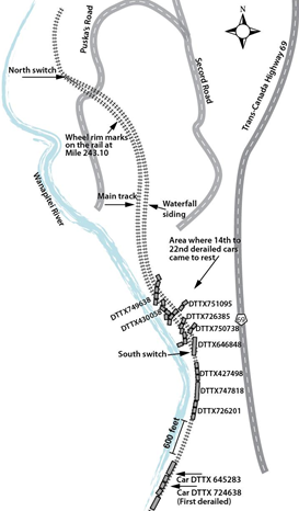 The crew then completed the required emergency broadcasts and determined that 11 intermodal rail cars, line 12 to 22, comprising 33 platforms loaded with 86 containers, had derailed and come to rest in the vicinity of the south siding switch (Mile 241.92). There were no injuries and no dangerous goods were released.