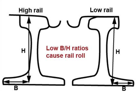 - Insufficient low rail rollover resistance due to lack of adjacent truck on articulated car to provide vertical rail hold down force, inadequate fastening system or spike kill, and shifting of the vertical contact and contact geometry towards the field side of the rail (B/H factor).