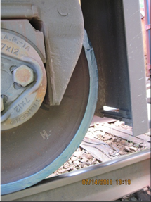 Car DTTX 724638, a 3-platform intermodal well car travelling with the B-end leading (Figure 3), derailed the trailing platform upright with the 5/6 and 7/8 wheel sets straddling the west rail. The leading truck was undamaged. The L3 and L4 wheels on the articulated C truck (Figure 3 and Photo 1b) came to rest damaged but not derailed. There were impact marks on the tread and severe abrasion and blueing on the face of the wheel rims. Freshly broken rail anchor fragments were present in the lead-end well of the C platform. The tread on the 5/6 and 7/8 wheels showed some surface roughness from the derailment, but not the severe damage observed on the L3/L4 wheels.