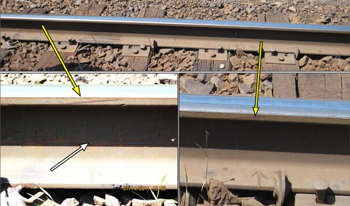 - The 2 drop-in locations were very close on the rail. However, the rim mark on the web of the low rail where the second mark on the web of the rail is located indicates that the L3 wheel was already derailed when the L4 wheel left the head of the rail: the time difference between the 2 drop-ins was short, but not simultaneous.