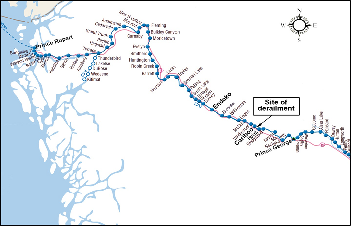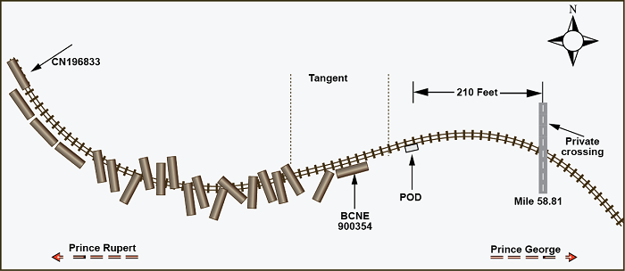 The Nechako Subdivision begins at Prince George (Mile 0) and extends westward ending at Endako (Mile 115.4). Train movements on this subdivision are governed by the Centralized Traffic Control (CTC) system as authorized by the Canadian Rail Operating Rules and supervised by a rail traffic controller (RTC) located in Edmonton, Alberta. In the vicinity of the derailment, the zone speed for freight trains was 35 mph.