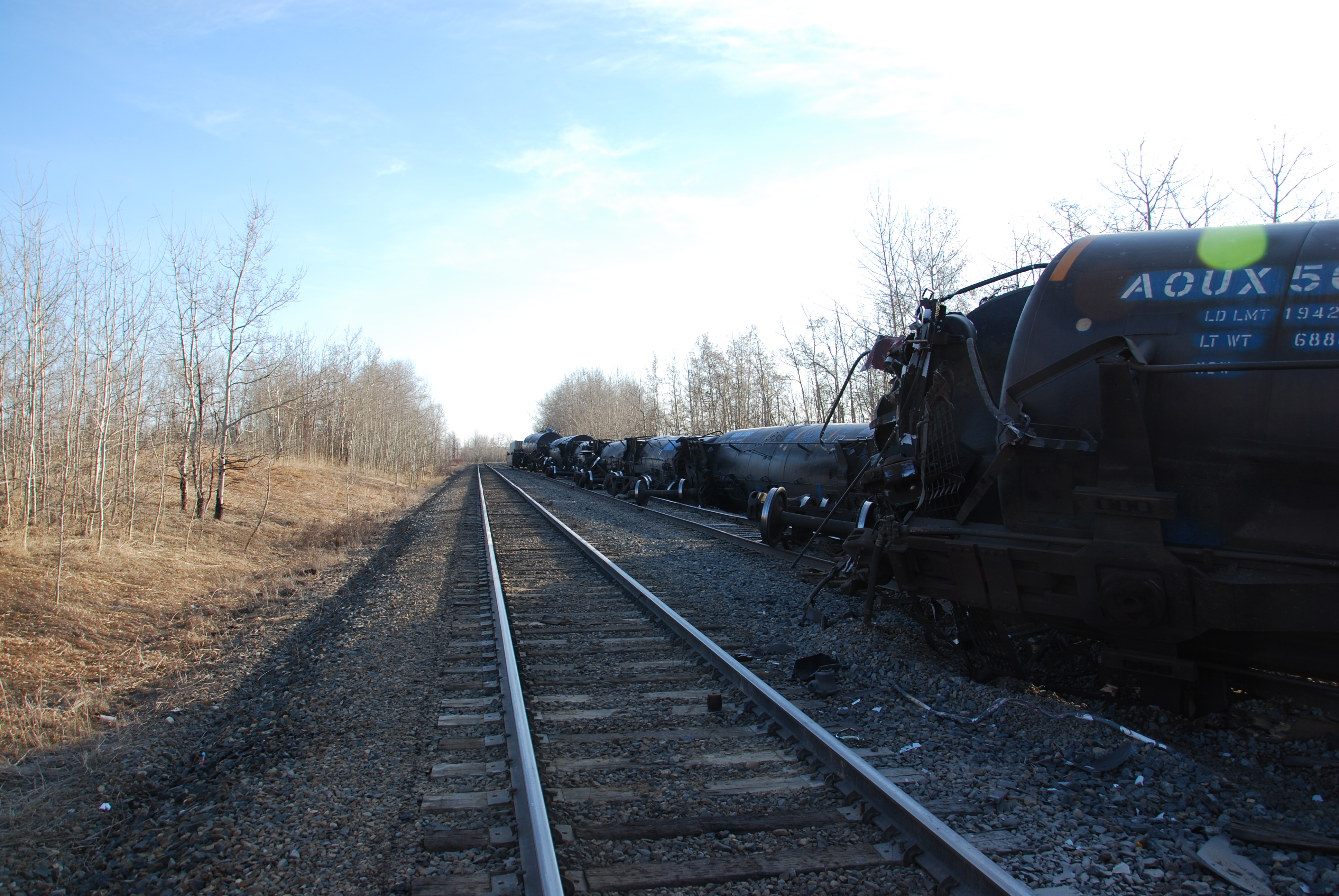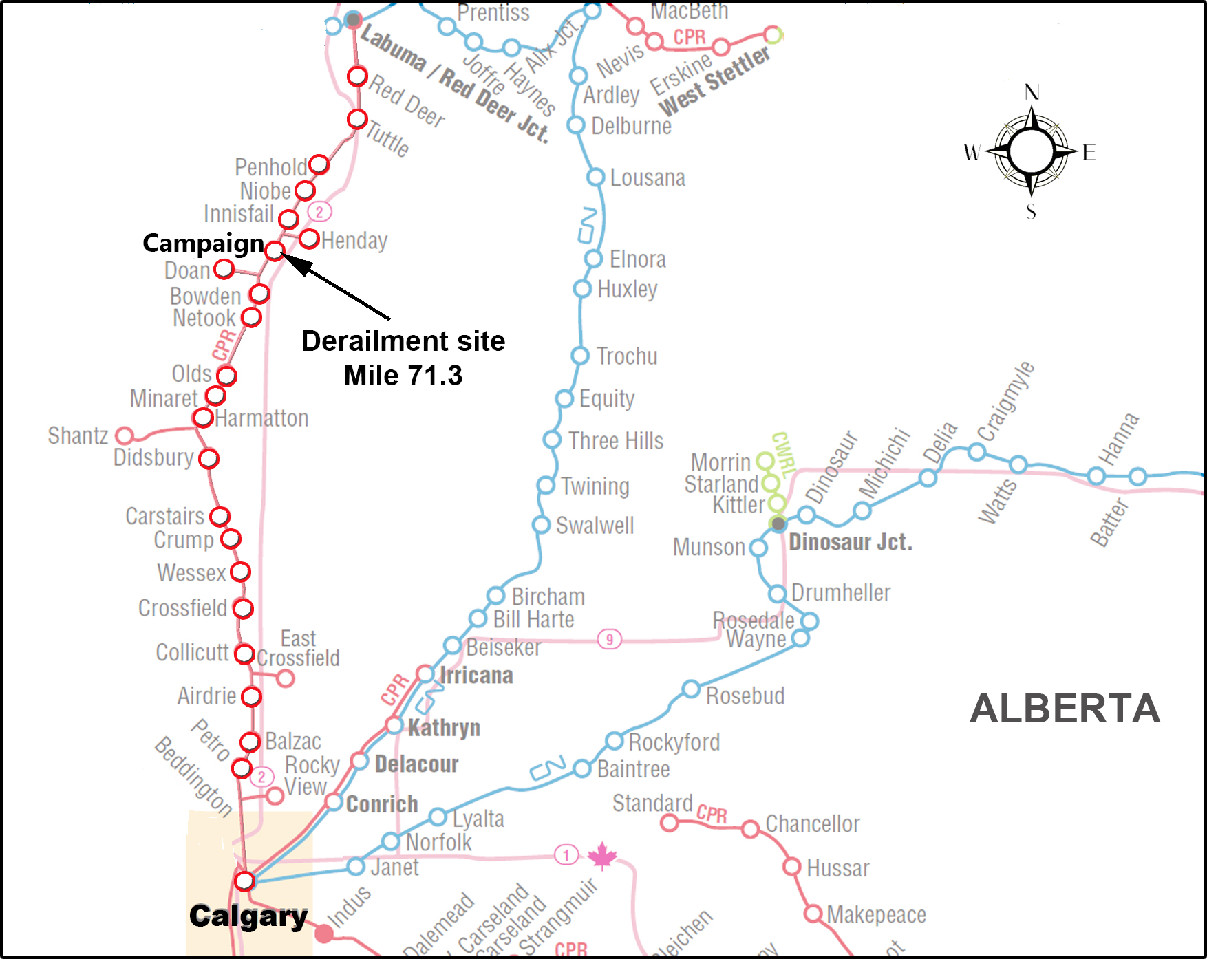 The accident occurred in a rural area approximately 7 km north of Bowden, Alberta. At this location, the track runs parallel to Highway No. 2.