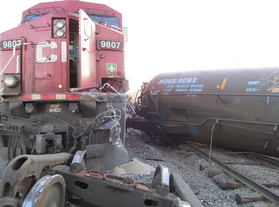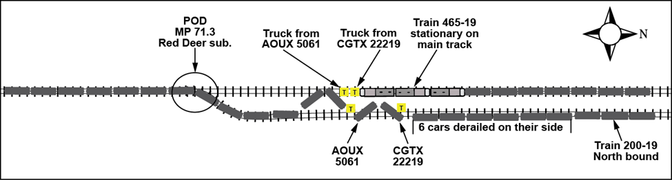 - The leading truck of the 12th car, CGTX 22219, had separated and came to rest beside the tank car. The trailing truck of this car had travelled down the main track and came to rest after striking the lead locomotive on train 465 (Figure 2).