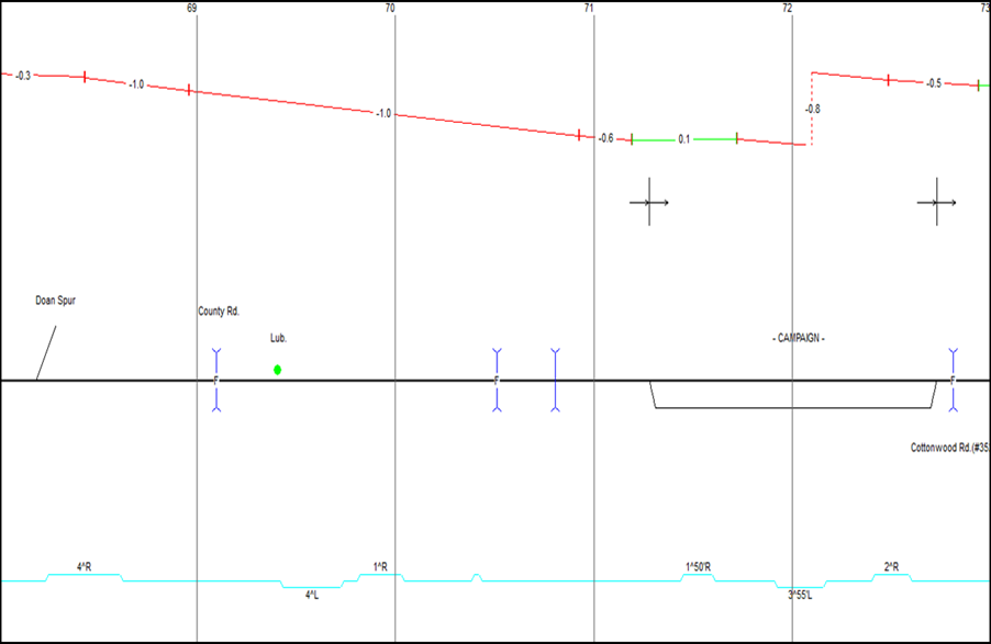 The track leading up to the south siding switch at Campaign is on a long descending grade (Figure 4). The steepest portion of the grade (that is, approximately 1.0%) occurs between Mile 68.43 and Mile 70.93. The south siding switch is located on tangent track at Mile 71.3, just north of the steepest part of the grade. In the vicinity of the switch, the grade changes from 0.6% (descending) to 0.1% (ascending) and then to 0.8% (descending).