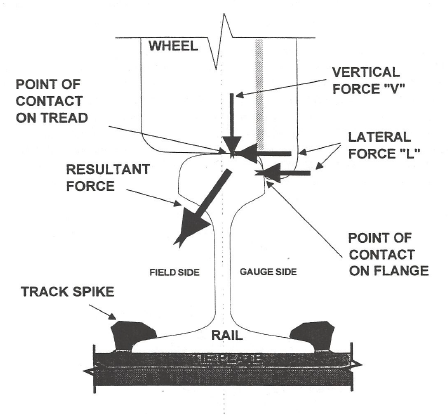 The wheel/rail interface sees a combination of lateral (L) and vertical (V) forces when a car is moving (Figure 5). The ratio of lateral-to-vertical (L/V) forces provides an indicator of the likelihood of a derailment. The tendency toward derailment increases as the L/V ratio increases. A high lateral and low vertical force (for example, empty cars travelling on a curve) could result in the wheel flange being pushed up and over the gauge face of the rail or result in