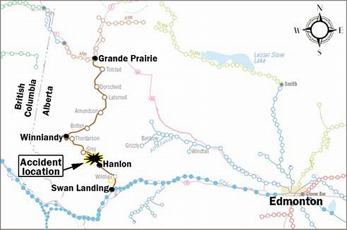 The Grande Cache Subdivision consists of single main track extending from Swan Landing to Grande Prairie, Alberta (Mile 232.9). This subdivision is part of CN's north/south freight traffic corridor. Train movements are controlled by the Occupancy Control System as authorized by the Canadian Rail Operating Rules (CROR) and supervised by a rail traffic controller located in Edmonton. In the vicinity of the derailment, the maximum permissible speed for freight trains was 25 mph.