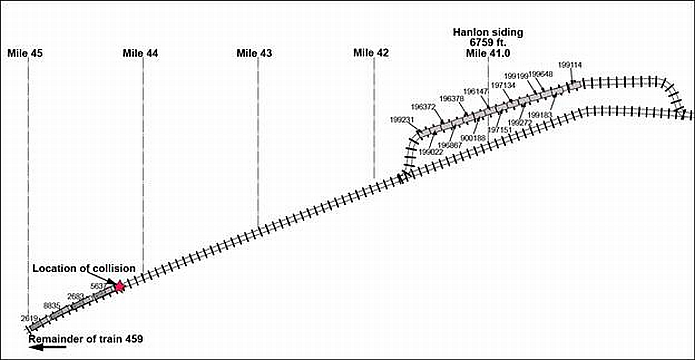 - The collision occurred when a cut of 13 loaded coal cars, which had been set out in the Hanlon siding the previous day by the crew of train 458, ran uncontrolled northward and collided with the head end of stationary train 459.