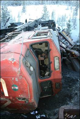 The 13 loaded coal cars had rolled northward uncontrolled down the 1% descending grade from the north end of the Hanlon siding, a distance of about 3 miles. As a result of the collision, the first 9 cars of the 13 loaded coal cars derailed, 7 of which were destroyed. The first 3 locomotives derailed and were extensively damaged. The lead locomotive came to rest on top of the 3rd locomotive (see Photo 1). Both the 2nd and 3rd locomotives derailed on their side. The 4th locomotive remained upright on the tracks and sustained minor damage. Approximately 2800 litres of fuel and 740 tons of coal were spilled. About 250 feet of track was damaged.
