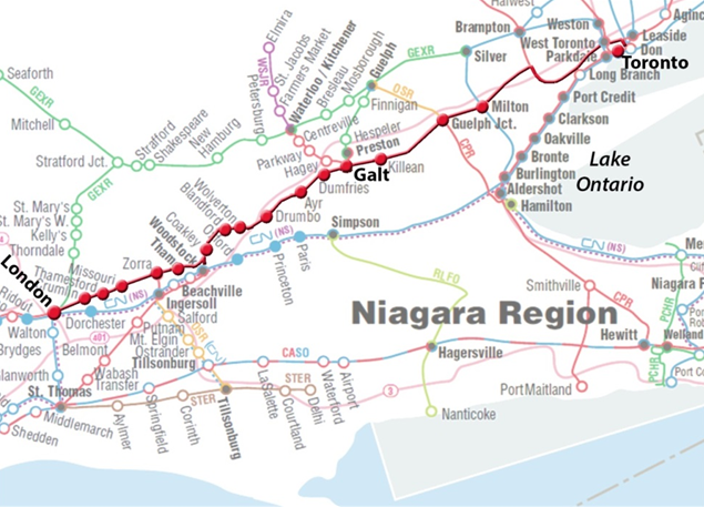 The Galt Subdivision extends from Mile 0.0 (Toronto) to Mile 114.6 (London). Trains operating in the vicinity of the accident site on the Galt Subdivision are governed by the Centralized Traffic Control System (CTC), authorized by the Canadian Rail Operating Rules (CROR) and supervised by a rail traffic controller (RTC) located in Montréal, Quebec. The subdivision mainly consists of single main track with speed limits varying from 35 to 65 mph. There are no scheduled trains departing London or arriving into London on the Galt Subdivision; therefore, train times vary day to day.