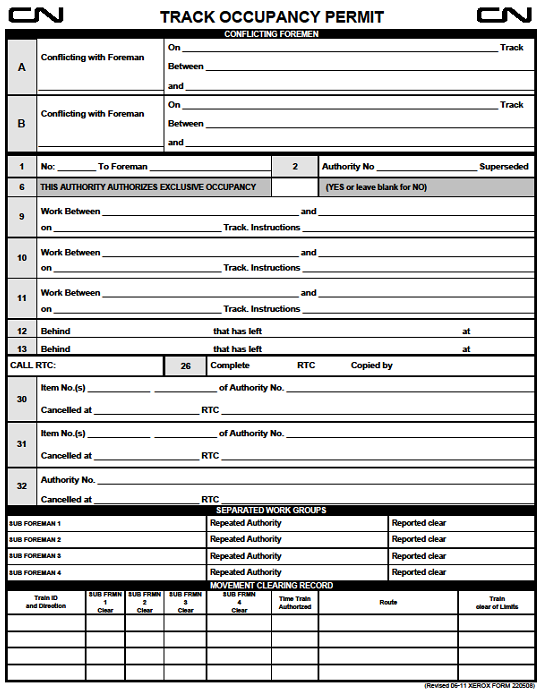In March 2012, CN conducted 18 rail traffic controller (RTC) efficiency tests involving follow-up track occupancy permits to ensure that proper procedures were followed.
