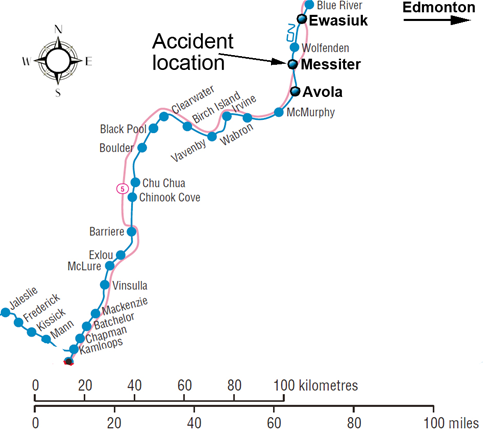 The Clearwater Subdivision consists of sections of double track and single main track. It extends west from Mile 0.0 (Blue River, British Columbia) to Mile 139.4 (Kamloops). This subdivision is an important east/west corridor for passenger trains and CN freight traffic. In the vicinity of the accident, the maximum permissible speed is 30 mph for freight trains, and 35 mph for passenger trains.