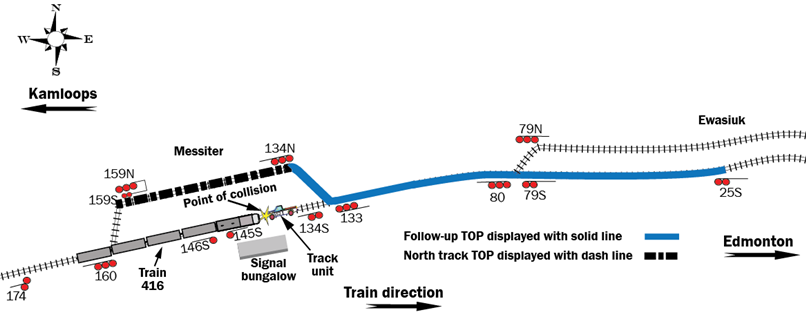 At about 0330, the rail traffic controller (RTC) issued a track occupancy permitFootnote 2 (TOP) with 2 segmentsFootnote 3 (Appendix A). The first segment was a follow-up TOP,Footnote 4 which allowed the foreman to follow behind train Q10131-11 (train 101). This segment was given for the south track and main tracks, between signal 25S at Mile 2.5 (Ewasiuk, British Columbia) and signal 134N at Mile 13.4 (Messiter East) (Figure 2). The second segment was given for the north track from signal 134N to signal 159N at Mile 15.9 (Messiter West). The TOP was issued over the radio, and the foreman wrote the instructions on to the proper form. The foreman correctly repeated the instructions back to the RTC, including the requirement to take the north track at Messiter East. No call-back time was arranged between the RTC and the foreman. During the communications, there was no indication given of switch position at Messiter East.
