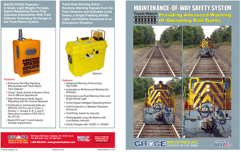 In the United States, some railroads (e.g., Union Pacific Railroad) use a system called Track Watch (Figure 3) to provide employees working on the track with advance warning of approaching trains. The system employs an optical track-mounted proximity device to detect the passing of a train. The system then sends a signal to a portable repeater, which relays the signal to personal receivers worn by each track worker. When a train is detected, the personal receiver device emits a loud audible alarm, a vibration alert, and a flashing light signal. There is also an optional track-side warning system which incorporates dual warning sirens and a strobe light. When operating in difficult terrain, a signal repeater can be used to increase the system's range.