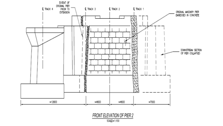 - In 1912, the stone masonry abutments and stone masonry pier were extended to the north (i.e., upstream) and the south (i.e., downstream) to accommodate an additional 2 tracks (Figure 1). The concrete pier extensions were poured against the existing piers without keying or otherwise anchoring the extensions into the masonry piers. The foundations for the concrete extensions at Pier no. 2 and Pier no. 4 were spread footingsFootnote 6 that were supported on shale bedrock at the same elevation as the original stone masonry caisson bases. Additional piers (i.e., Pier no. 1 and Pier no. 3) and a new west abutment were constructed of concrete on reinforced concrete spread footings that were supported on shale bedrock. The concrete extension footing for Pier no. 2 was connected with reinforcing bars to a false footing around the base of the original pier to protect the pier from impact and undermining.