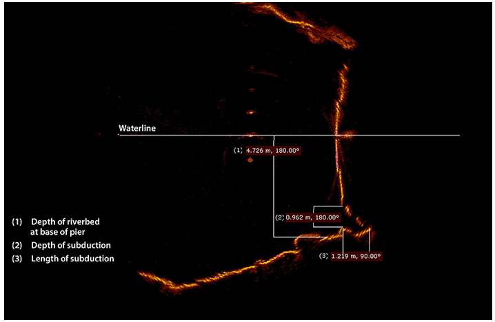| Sonar drop no. | Depth to riverbed at base of scour (m) | Depth of subduction* (m) | Length of subduction (m) |