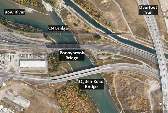 - The City of Calgary's Ogden Road Bridge is situated downstream of the CP Bonnybrook Bridge. The Ogden Road Bridge was unaffected by the flood waters.