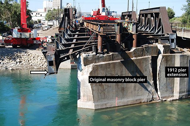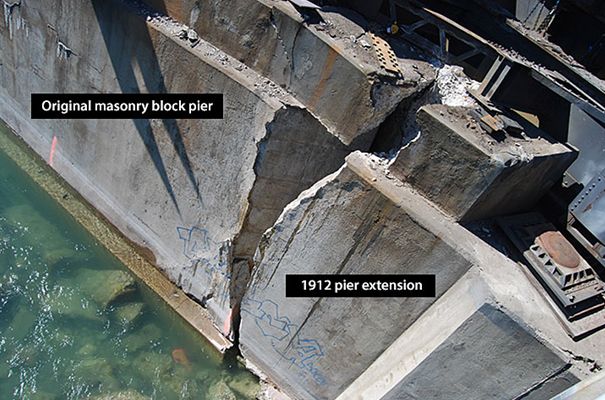 - The lack of keying or connecting of the original masonry block pier to the 1912 extension allowed the upstream extension to separate cleanly, without further damaging the 1969 bridge pier.