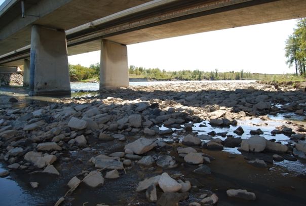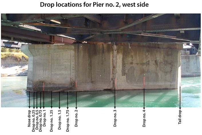 Routine visual inspections of the pier foundations during low water flows were conducted as part of annual inspections. During the recent visual inspections of the Bonnybrook Bridge, there was no evidence of foundation scour.
