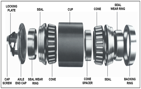 The cup, rollers, and cone raceways are case-hardened with precision finishes for the closely matched mating surfaces. The cage acts as a spacer that keeps the rollers in place within the cone assembly. The entire assembly is pressed on an axle journal and seated against the axle journal fillet radius. It is kept in place by an end cap, secured to the end of the axle with 3 cap screws fixed in place by a locking plate.