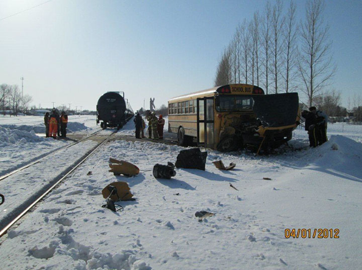 The front of the bus body was collapsed and torn off. The bus debris primarily came to rest on the west side of the roadway and along the railway right-of-way for about 100 feet (30.5 m) down the track in the direction of train movement.