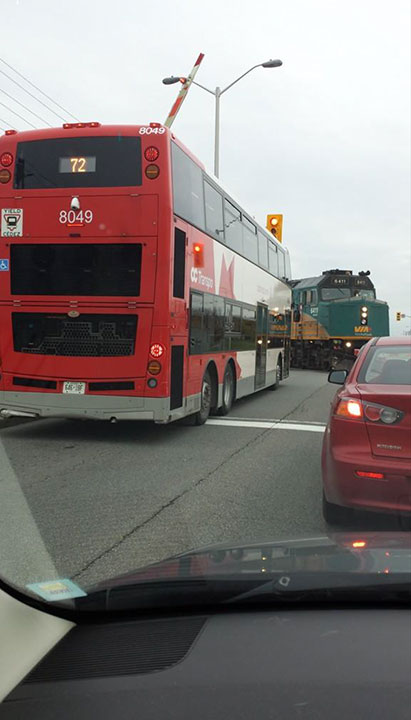 Shortly after the accident, 2 OC Transpo buses (a 60-foot-long articulated bus and a 40-foot-long single bus) stopped behind the occurrence bus at the crossing. A number of passengers from the trailing buses exited to assist.