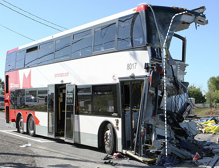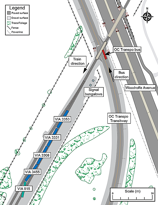 On 18 September 2013, at about 0832 Eastern Daylight Time, westward VIA Rail Canada Inc. (VIA) passenger train No. 51 departed from the VIA Ottawa Station on time and proceeded en route to Toronto. At 0847:27, OC Transpo double-decker bus No. 8017 departed from the Fallowfield Station on the OC Transpo bus Transitway. At 0848:06, while proceeding at about 43 mph, the train entered the OC Transpo Transitway crossing, located at Mile 3.30 of VIA’s Smiths Falls Subdivision. At the time, the crossing lights, bells and gates were activated. The northbound bus was travelling at about 5 mph with the brakes applied when it struck the train. As a result of the collision, the front of the bus was torn off. The train, comprising 1 locomotive and 4 passenger cars, derailed but remained upright. Among the bus occupants, there were 6 fatalities and 9 serious injuries, and about 25 minor injuries were reported. No VIA crew members or VIA passengers were injured.