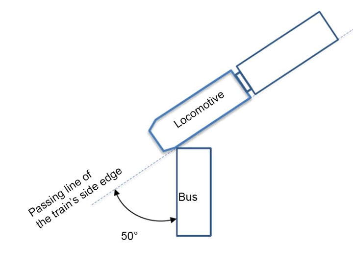 At the railway crossing, the Transitway crosses the track at a 50-degree angle. The relative orientation of the bus and the locomotive just prior to impact is depicted in Figure 3.