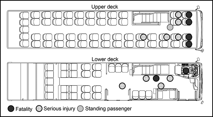 Schematic of double-decker bus layout with location of occupants who sustained fatal and serious injuries