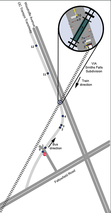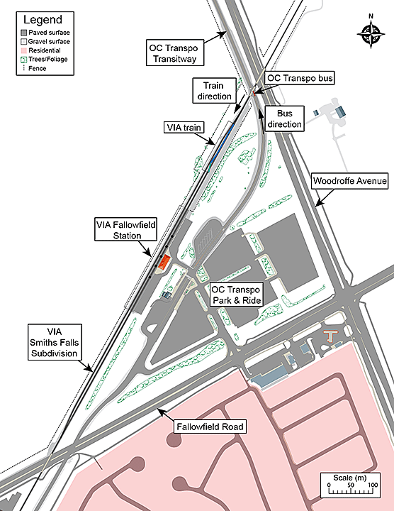 On 18 September 2013, the train departed from the VIA Ottawa Station on time at 0831:57.Footnote 2, Footnote 3 The train's next stop was VIA Fallowfield Station, located at the west end of Ottawa at Mile 3.57 of the VIA Smiths Falls Subdivision. Prior to arriving at VIA Fallowfield Station, westbound trains must pass through the level grade crossings at Woodroffe Avenue and the Transitway, located at Mile 3.28 and Mile 3.30 respectively.