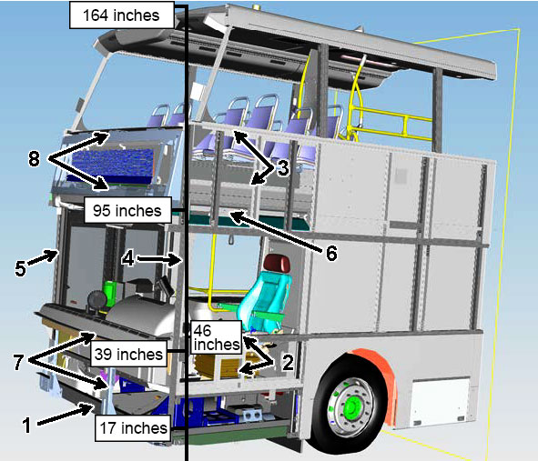 The driver's seat and the 4 seats on the 2 foremost rows of passenger seats on the left side of the upper deck were torn from the bus along with their supporting floor structure (Figure 4), coming to rest on the adjacent roadway west of the bus. The frame of these passenger seats had no significant damage, as the seats had not been directly struck by the train, nor did the impact with the ground exceed the seat design strength.