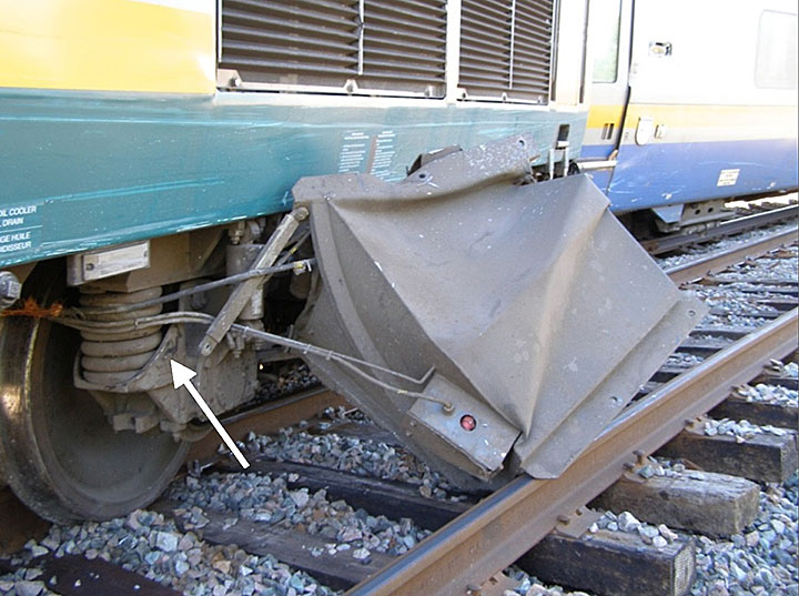 Image of impact mark on locomotive VIA 915's rear truck side frame (arrow) and separated battery box