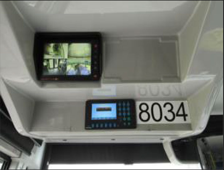 The driver asked a group of 3 or 4 passengers standing at the front of the bus to stand behind the yellow line on the floor. With the bus still stationary, the driver looked at the bus video monitor, located on a forward panel above the driver station and to the left of the driver seat. The video monitor display (6 inches [15.2 cm] wide by 3¾ inches [9.5 cm] high) was divided into 4 quadrants, each measuring 3 inches (7.6 cm) wide by 17⁄8 inches (5 cm) high. Each quadrant displayed a view from 1 of 4 on-board video cameras. The bottom right quadrant displayed a rearward-facing view from the front of the upper deck.