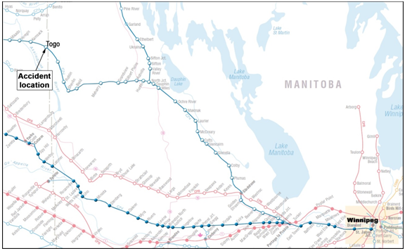Rail traffic on the Togo Subdivision is operated under the Occupancy Control System, as authorized by the Canadian Rail Operating Rules (CROR), and supervised by a rail traffic controller in Edmonton, Alberta. In the vicinity of the accident, the maximum speed for freight trains and passenger trains is 35 mph and 40 mph respectively. According to the Transport Canada–approved Track Safety Rules, the track is designated as Class 3.