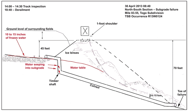 - At Mile 83.55, a “ballast pocket”Footnote 9 was likely present, creating a perched water table within the track embankment leading to saturation of the fill and formation of the observed ice lenses.