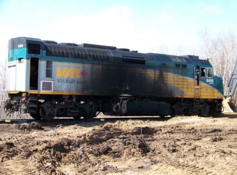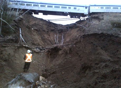 On 28 April 2013, at approximately 1840 Central Standard Time, VIA Rail northward passenger train No. P69341-28 encountered a roadbed slump at Mile 83.55 of the Canadian National Railway Togo Subdivision, near Togo, Saskatchewan. The two locomotives and the two leading cars derailed. The fuel tanks on both locomotives ruptured, leaking diesel fuel that ignited and burned until it dissipated into the subgrade material. There were no injuries.