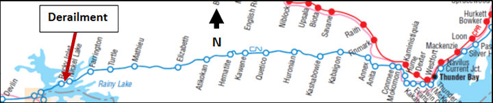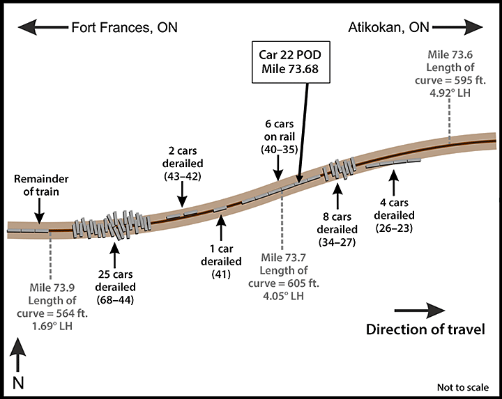 At 1727, the train derailed at Mile 73.6 of the Fort Frances Subdivision, near Nickel Lake, Ontario (Figure 1). At the time of the occurrence, the temperature was −10°C and it was snowing lightly.