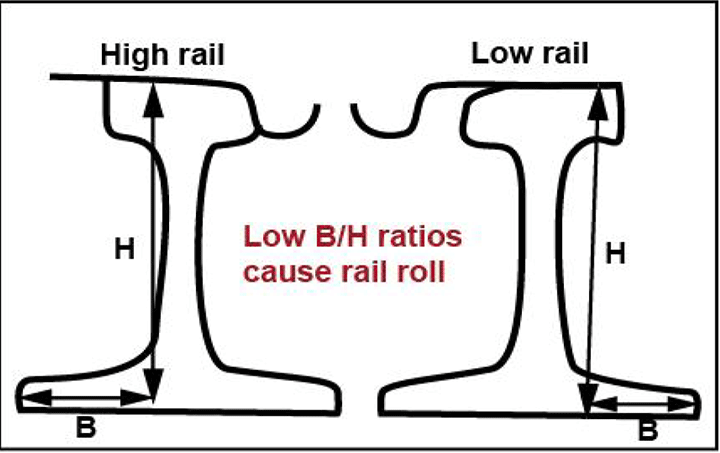 A Transportation Technology Center, Inc./Norfolk Southern report (TD-11-052, Root Cause of Rail Roll/Reverse Rail Cant) determined that certain track maintenance tasks (e.g., gauging, rail cant restoration and tie renewal) can result in track conditions that are susceptible to high lateral forces, reducing the track structure's ability to resist gauge-widening forces. In curves, these track maintenance activities tend to move the contact position of the wheel towards the field side of the high rail and towards the gauge side of the low rail. The high rail will tend to have strong 2-point contact, resulting in poor curving performance. Vertical load applied to the field side of rail, due to poor wheel/rail profile contact, results in low rail base/rail height (B/H) ratiosFootnote 13 (Figure 3) and a high risk of rail rolloverFootnote 14 unless the rail profile is corrected by rail grinding.