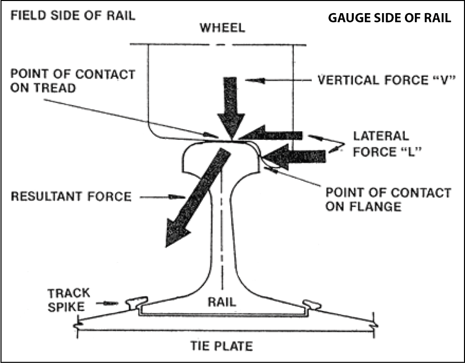 A combination of lateral (L) and vertical (V) forces exist at the wheel/rail contact (Figure 4). The ratio of lateral-to-vertical (L/V) forces provides an indication of the likelihood of a derailment. The probability of a derailment increases as the L/V ratio increases. A high lateral force, combined with a low vertical force (e.g., empty cars), will tend to push the wheel flange up and over the gauge face of the rail (i.e., wheel climb), or push the rail outward with sufficient force to cant the rail outward and roll over the rail.