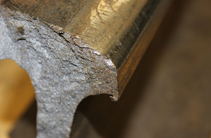 - On the smaller piece of rail (Photo 6), which was from the high rail of the curve, there were signs of batter and wheel strike marks.