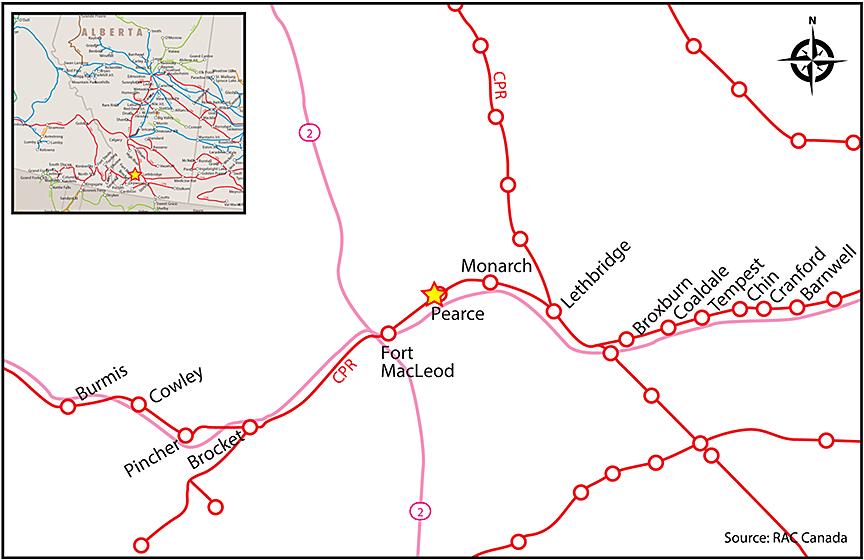 On 06 November 2014, at about 0115,Footnote 1 Canadian Pacific Railway (CP) freight train 374-230 (the train) was proceeding eastward at approximately 40 mph, when the tail-end 17 cars derailed at Mile 23.40 of the Crowsnest Subdivision, near Pearce, Alberta (Figure 1).